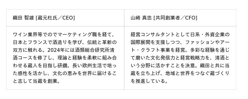 記念すべき当蔵のデビューに際し、二人の巨匠より味わいの方向性について貴重な助言を賜りました。蔵元杜氏・織田の責任で醸す酒に、彼らの知恵と経験がアッサンブラージュされ、唯一無二の調和が生まれます。