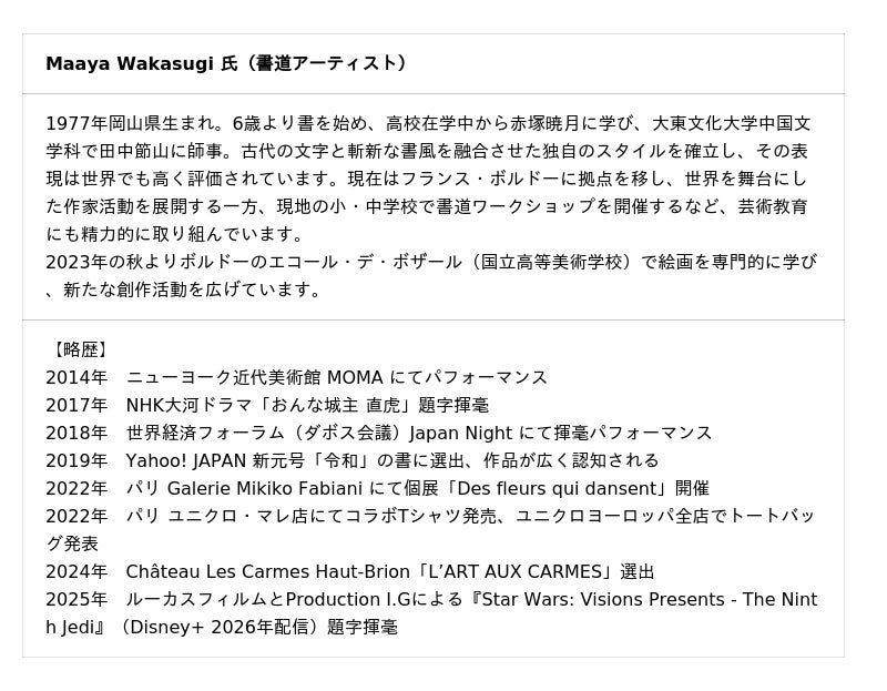 内容:監修者と蔵元杜氏によるアッサンブラージュ・トーク、SAKE DE BORDEAUXロゴ揮毫アーティストのMaaya Wakasugi氏による揮毫パフォーマンス、 ライブ演奏やDJ、新酒フリーフローなど。そのひとときは、清酒と芸術が共鳴する祝祭の舞台となります。