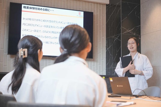 かっぱ寿司を運営するカッパ・クリエイト株式会社では、食のインフラの担い手として、持続可能な社会の発展への貢献と企業価値の向上を目指し、当社がマテリアリティとして掲げている地域・社会への貢献の一環として、中学生を対象とした職業体験プログラムを実施しました。