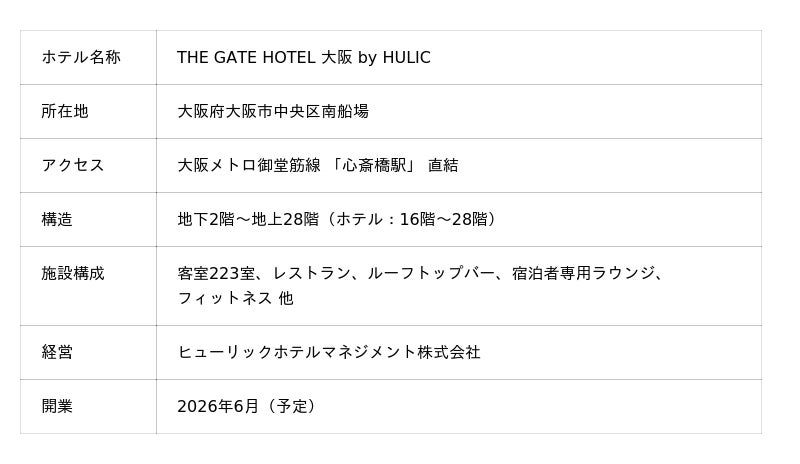 ヒューリックホテルマネジメント株式会社(所在地:東京都中央区日本橋小舟町13-8)は、『THE GATE HOTEL 大阪 by HULIC』を、2026年6月に大阪・心斎橋に開業いたします。