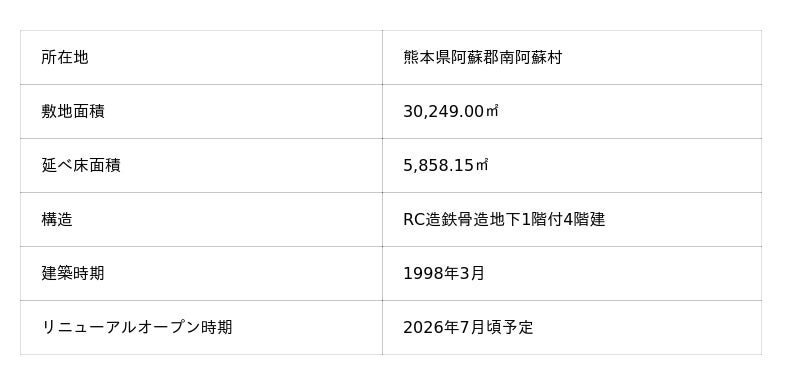 四季折々に表情を変える自然の景観を眺めながら温泉を楽しみ、オールインクルーシブでゆったり過ごせるのも本施設ならではの魅力です。阿蘇の大自然と温泉が融合するリゾート体験をご提供いたします。大江戸温泉物語グループとして、熊本県での出店は天草ホテル亀屋に続き2施設目となります。