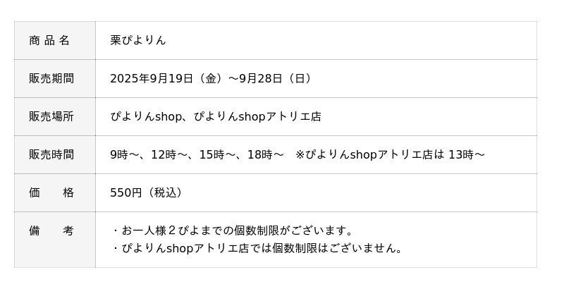 ジェイアール東海フードサービス株式会社(本社:愛知県名古屋市、代表取締役社長:岩下賢一)は、人気のオリジナルスイーツ「ぴよりん」の季節限定商品「栗ぴよりん」を、2025年9月19日(金)から9月28日(日)までの期間限定で販売いたします。ほっくりとした栗の風味とやさしい甘さが特徴の「栗ぴよりん」は、秋の訪れを感じながら味わえる一品。秋の味覚を存分に楽しめる「栗ぴよりん」で、ほっこりとした贅沢なひとときをお過ごしください。