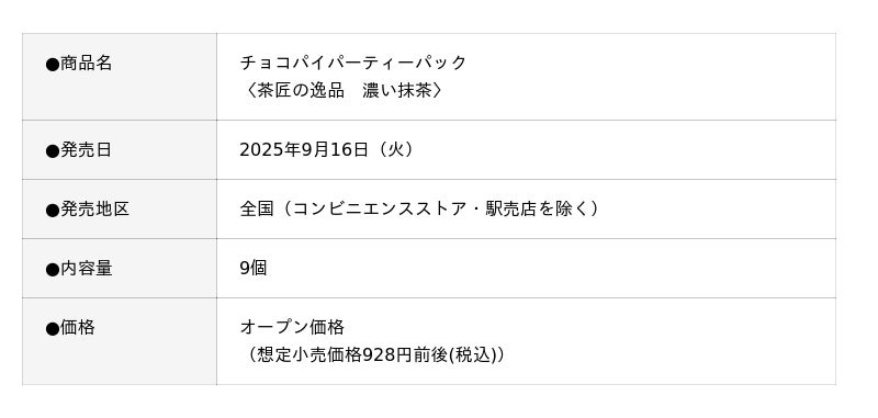 株式会社ロッテ(東京都新宿区、代表取締役社長執行役員:中島英樹、以下ロッテ)は2025年9月16日(火)に「チョコパイパーティーパック〈茶匠の逸品 濃い抹茶〉」を発売します。