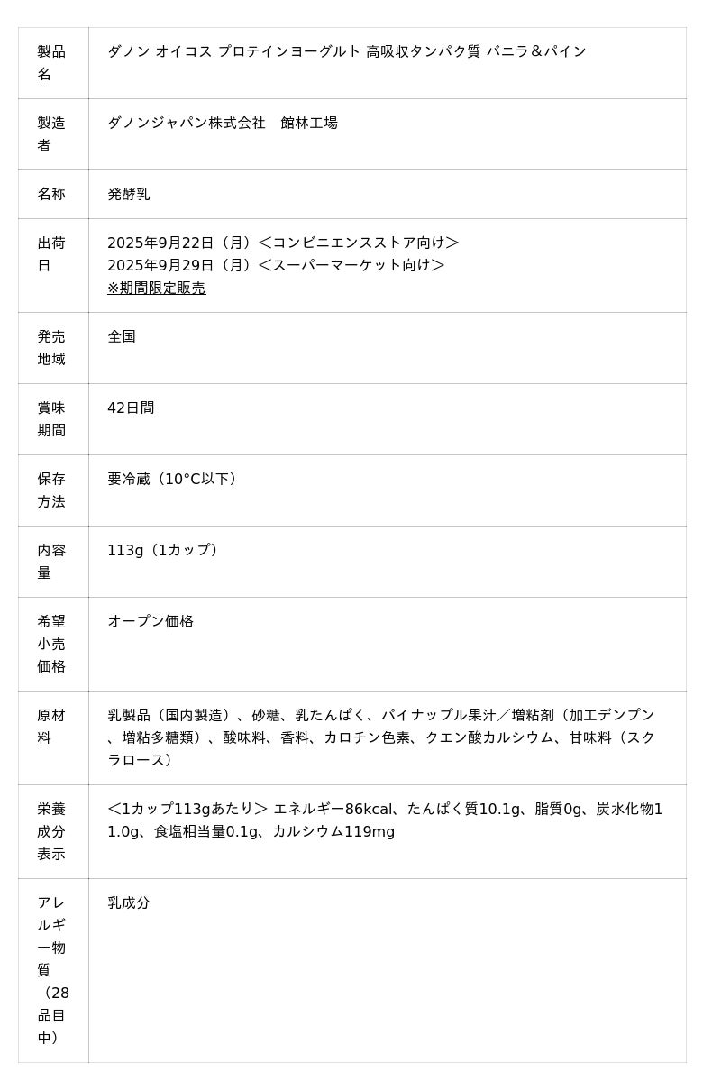 ダノンジャパン株式会社(本社:東京都目黒区、代表取締役社長:ロドリゴ・リマ、以下ダノンジャパン)は、カラダを動かすすべての人の良質なタンパク質補給を応援する「ダノン オイコス」ブランドより、期間限定フレーバーの「ダノン オイコス プロテインヨーグルト 高吸収タンパク質 バニラ&パイン」を発売します。2025年9月22日(月)より全国のコンビニエンスストア向けに、9月29日(月)より全国のスーパーマーケット向けに出荷を開始します。「ダノン オイコス」ではこれまで、季節に合わせた期間限定フレーバーを3か月ごとに展開してきましたが、当製品は新たに導入する半年ごとの期間限定シリーズの第一弾です。濃厚で上品なバニラの風味をベースに、品種の異なる2種類のパイナップル果汁を加えることで、バニラのまろやかさと南国果実ならではの華やかさが溶け合った奥行きのある味わいに仕上げました。フレーバーをヨーグルト全体に混ぜ込んだブレンドタイプで、ひと口目から最後まで変わらない豊かな風味をお楽しみいただけます。