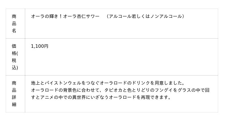 - キャラクターを想わせる個性的なドリンクやおつまみ、デザートもご用意