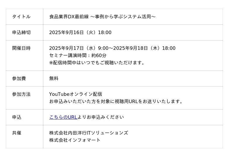 今回の標準連携インターフェースの提供に伴い、食品業界関係者を対象に、共催オンラインセミナーを2025年9月17日(水)に開催します。