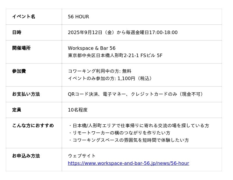 「Workspace & Bar 56」は、多様なバックグラウンドを持つ人々が集まるコワーキングスペースです。ひとり社長、フリーランス、スタートアップ企業の経営者、リモートワーカーなど、様々な方が日々利用されています。これまでは、イベントや個別の交流を通じてコミュニティを育んでまいりましたが、より多くの方が気軽に繋がりを持てるよう、この度「56 HOUR」を企画いたしました。