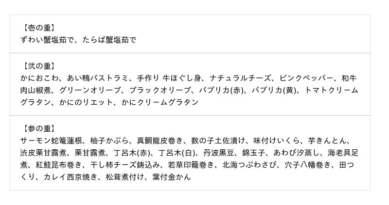 和洋折衷47品の見た目も華やかなの品揃えの寿(ことほぎ)。たらば・ずわいと蟹がしっかり堪能できる上、あわび汐蒸しや数の子土佐漬け、味付けいくらや錦玉子などの伝統的なおせち料理から、あい鴨スモークやはもバジル和えなど洋風アレンジの逸品までさまざまな味わいが楽しめます。