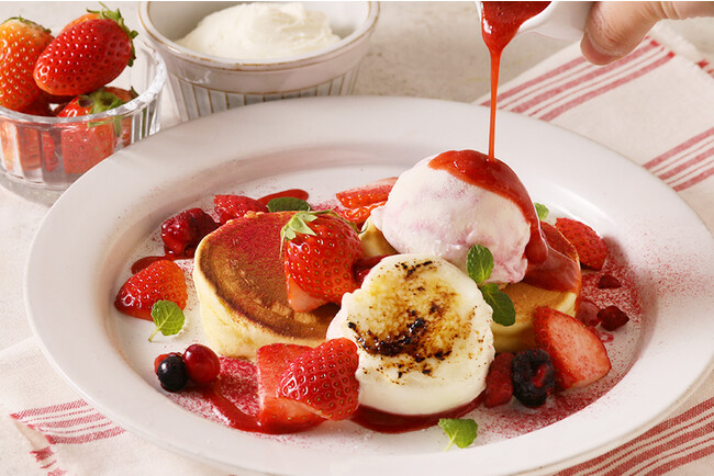 米粉のパンケーキに、果肉入りのいちごソースをたっぷりとかけながらお召し上げりください。