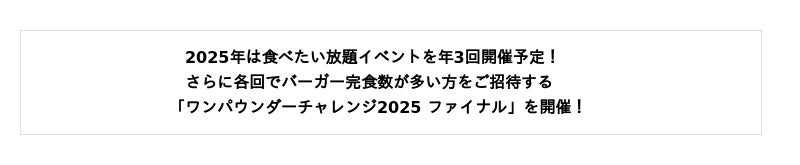 さらに、各回でバーガーを完食した数が多かった3名様(計9名様)を2026年1月に開催予定の「ワンパウンダーチャレンジ2025 ファイナル」へご招待いたします。