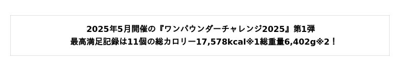 2025年5月に開催された『ワンパウンダーチャレンジ2025』第1弾では、45分間で『デラマキシ ザ・ワンパウンダー』11個完食が満足記録となっております。