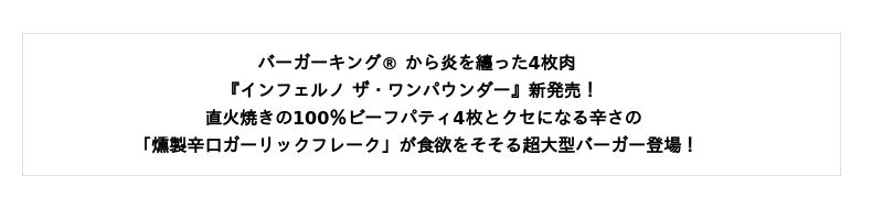 “ワンパウンダーシリーズ”好きの皆様も、辛い物好きの皆様も、総カロリー1,390kcal*1、総重量453g*2の旨さと辛さがクセになる超大型バーガー『インフェルノ ザ・ワンパウンダー』をぜひこの機会に存分にお楽しみください。