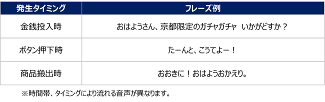 本自販機は、京都の観光振興を目的に自販機を通じて様々な観光資源を活かした貢献が出来ればと考え企画したもので、京都の有名寺院 や「京都タワー」など京都の観光地をデザインしたカプセルフィギュアを購入できます。また、金銭投入時・商品搬出時には、オリジナル音声メッセージが流れる機能を搭載しており、本自販機を通じて観光にて訪れる方や地域の皆さまをはじめ、多くの方々にお楽しみいただけると期待しております。