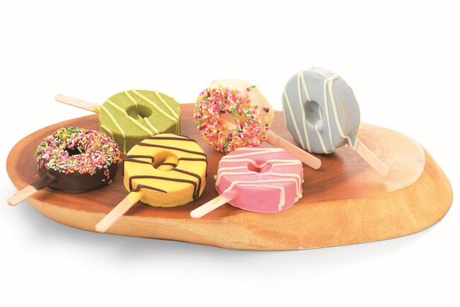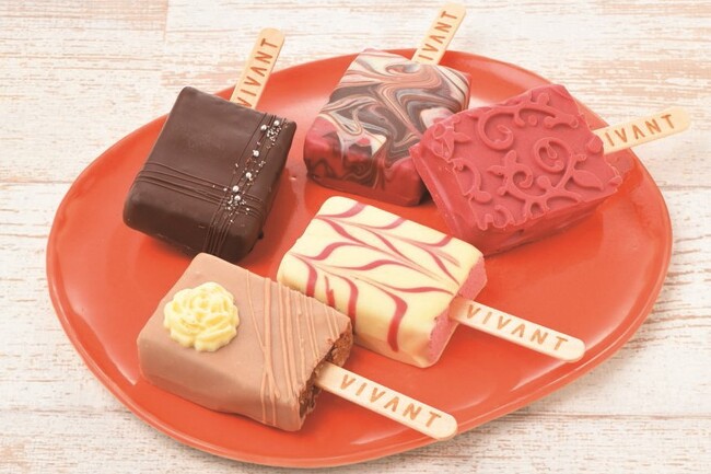 アイスキャンディーをイメージした可愛らしい見た目の平焼きバウムクーヘンが登場。米粉を配合し、16層で仕上げたしっとりとした食感の生地とコーティングされた濃厚なチョコレートが絶妙な一品。「ストロベリーホワイト」「プレーンマーブル」「チョコマロン」「ストロベリー」「チョコダーク」がセットになっています。
