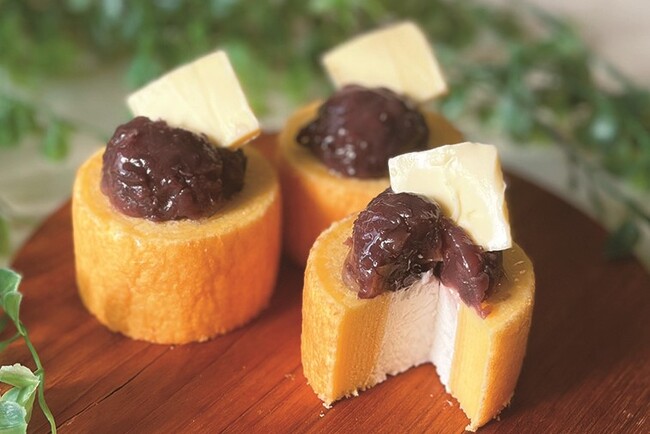 人気観光地・小樽市に店を構える「小樽石蔵バウム」。柔らかい食感のバウムクーヘンの中に、ふんわり滑らかな舌触りのカスタードホイップをたっぷりと詰め、北海道産の小豆を使用した粒あんとバターをトッピングしました。
