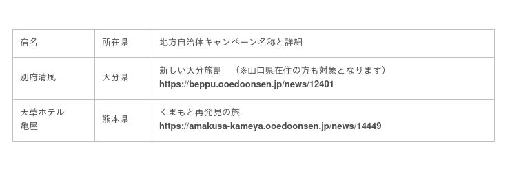 本リリースでご紹介する、大分県と熊本県の宿でご利用いただける地方自治体キャンペーンと各宿の魅力、秋のグルメバイキング情報をご案内申し上げます。