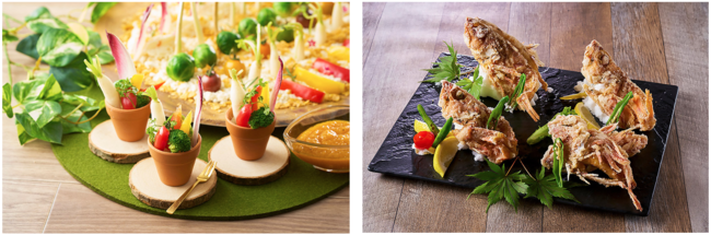 左:収穫の秋をイメージした、彩り鮮やかな「野菜畑のバーニャカウダ」。気軽につまめるサイズにカットされた野菜に、人参ドレッシングをたっぷりつけてどうぞ。