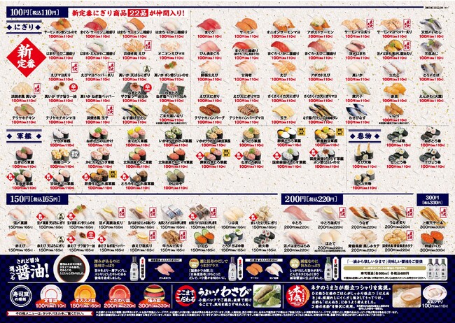“新”定番メニューでは、一皿100円(税込110円)のお寿司が30商品追加の84商品(※1)となり、豊富なラインアップからお選びいただけます。絶対的定番の『まぐろ』『活〆はまち』『サーモン』『えび』などの人気商品や長野県でダントツ人気No.1の『サラダ軍艦』に加え、今回から仲間入りした『ねぎとろ ねぎ塩ペッパー包み』や『真いか ザク旨ラー油』『とろろ牛しぐれ煮軍艦』などの創作寿司まで、バラエティ豊かなネタを多数ご用意しております。