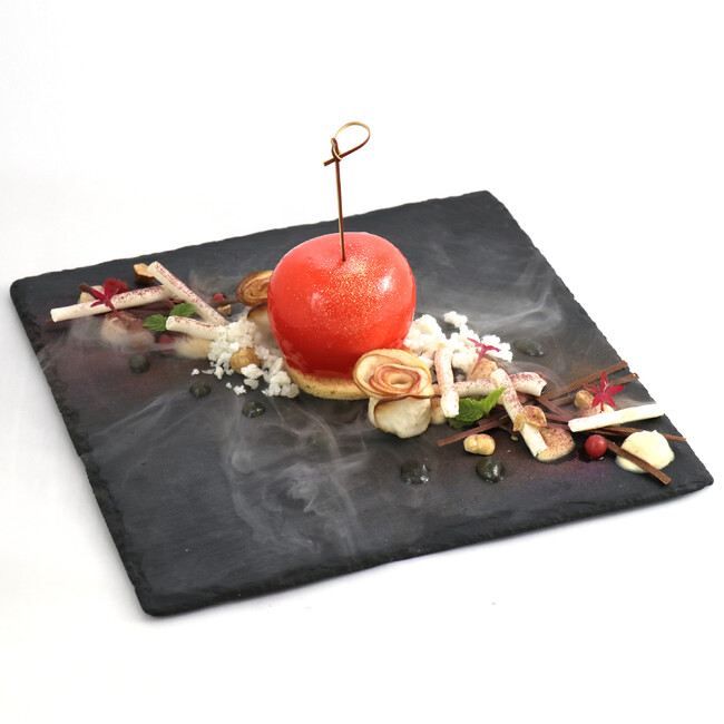 ご提供時には液体窒素を使用したりんごのシャーベットを散りばめて仕上げます。