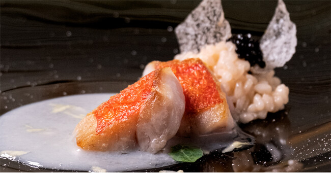 ~鮮魚のクロッカンテ 甘酒のサルサと謙太郎米のリゾット キャビアとワサビを添えて~