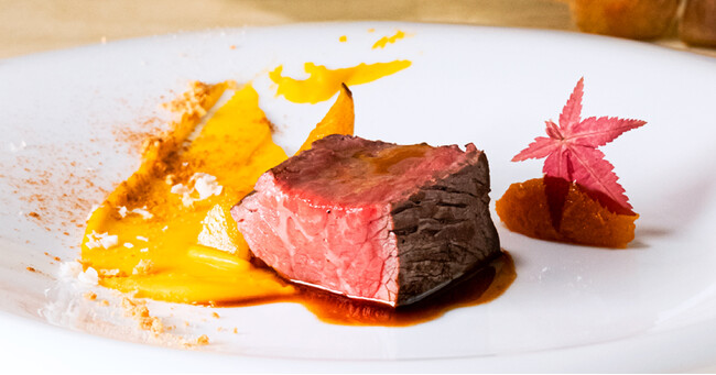 あいち鴨や群馬県鳥山牧場の赤城和牛などシェフ選りすぐりの食材に、木の実やきのこなど旬の味わいをたっぷりと添えて。“食欲の秋”を刺激するひと皿ひと皿は、物語を想起させる美しい盛り付けでお楽しみいただけます。味覚だけでなく視覚でも味わう秋のごちそう8品をどうぞ、お召し上がりください。