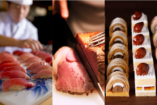 週末のオールデイダイニング「SATSUKI」を舞台に、肉・寿司を中心に秋の美味しい食材を使用した贅沢グルメビュッフェを開催。味わい、ジューシーさ、柔らかさの全てにおいて高い品質が認められた「USプライムビーフ」をホテル伝統の製法で仕上げた究極の逸品『USプライムのローストビーフ』や、鮪やサーモンなど厳選したネタの旨みを引き立てる「赤シャリ」を使用した『江戸前寿司』、海老や白身魚のほか、さつまいもやかぼちゃといった秋の味覚をカラッと揚げた『天麩羅』、また本格上海料理「大観苑」からは『黒酢酢豚』や『中華風スパニッシュオムレツ』など、和・洋・中の王道人気メニューを取り揃えたラインナップでお届けします。