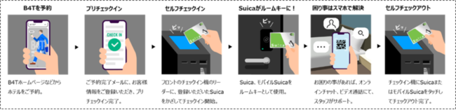 予約からチェックイン、チェックアウトまでの手続きが、お手持ちのSuicaとスマートフォンで完結します。滞在中のお困り事は、スマートフォンよりオンラインチャット、ビデオ通話にてスタッフがサポートします。