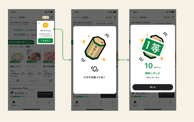 国内No.1のレシピ動画サービス (※1) 「kurashiru」 (以下、クラシル) を運営するdely株式会社 (本社:東京都港区、代表取締役:堀江裕介 以下、dely) が提供するEコマース専用スーパー「クラシルマート」は、アプリ内でおみくじを引くと、1等から4等まで、最大10円分のポイントが付与される「毎日おみくじ機能」を開始しました。おみくじは1日につき1回まで引くことができます。