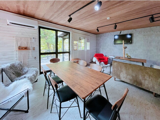さらに、元のカフェの雰囲気をさりげなく伝えられるように、ダイニングとソファスペースの椅子は向かい合って配置され、食事や談話等、滞在者の方々が団欒を一層楽しむ為の空間を演出しています。また、3人まで一緒に入ることができる広々としたバスルームや開放感のあるウッドテラスも魅力のポイントとなります。