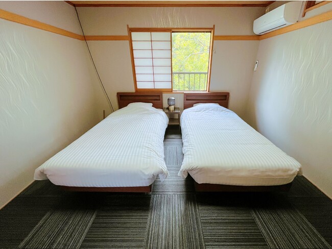 ベッドだけでなく布団も揃っており、好みに合ったスペースでお寛ぎいただけます。別荘地のメイン道路沿いでありながら非常に閑静な一帯であり、落ち着いた滞在が可能となっています。