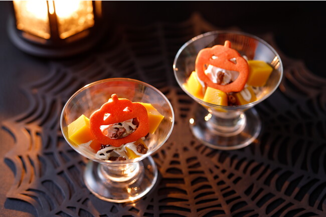 さつまいも、栗、かぼちゃ3種類のモンブランの食べ比べをはじめ、秋の味覚を堪能できる20種類以上のスイーツに、シェフパティシエ考案の『ハロウィーンパフェ』が新たに加わります。ふわふわのシフォンケーキの上にまろやかなソフトクリーム、かぼちゃ羊羹を重ね、アクセントにシナモン風味のクッキークランチをトッピング。コーヒーとマスカルポーネを合わせた特製ソースとランタンクッキーで、ハロウィーン気分を盛り上げるパフェに仕上げました。