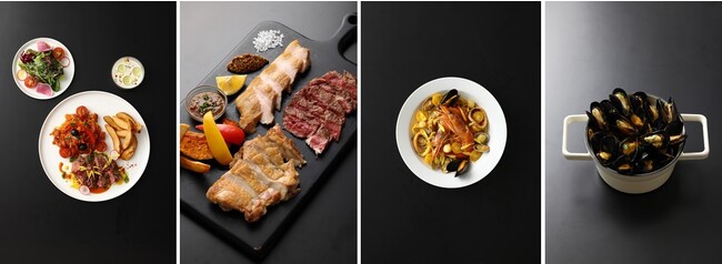 メニュ一例(左から): LUNCH「カンペールプレート A」¥2,970、DINNER「肉料理3種盛り合わせ ピメントオリエンタルソース」¥3,300、「スパゲッティ サルスエラ」¥2,200、「ムール貝の白ワイン蒸し サフラン風味」 ¥2,200