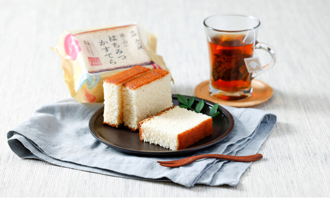 定番の長崎五三焼かすてらは和三盆の素朴な甘さが特徴ですが、「長崎 五三焼 淡く白い はちみつかすてら」にはコクと香りのある国産“蜂蜜”を加えました。開けた瞬間、蜂蜜の芳醇な甘い香りが広がり、食べるとコクのある甘みが楽しめます。また、主たる原料の米卵、もち米、水飴、蜂蜜、和三盆糖は全て国産にこだわり、厳選しております。