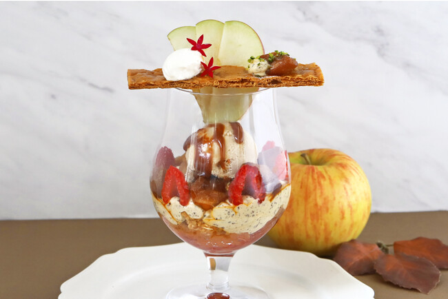 林檎とキャラメル、紅茶の風味がマリージュした、深みのある味わいが魅力。自家製のキャラメルソースや紅茶の香り豊かなディプロマットクリームがコクのある味わいをグラスに表現した一品。