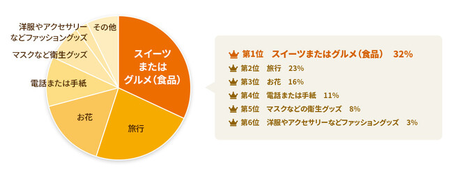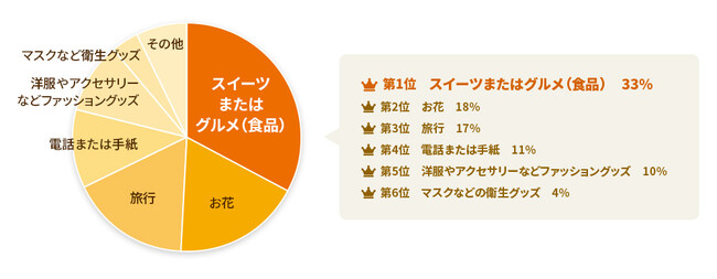 今年、特にもらいたいプレゼントはスイーツなどの食品系、旅行、お花と続きました。