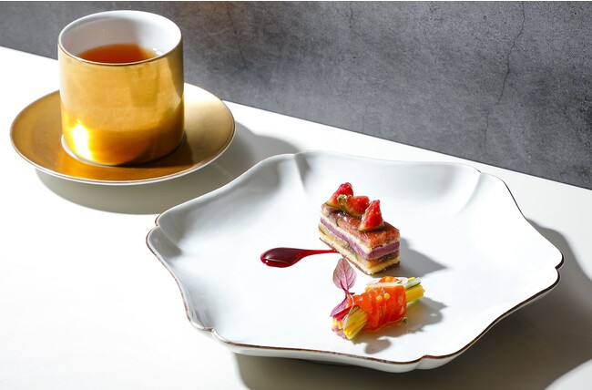 2番目のディッシュは、自家製サーモンマリネにフレッシュな野菜のクルディテを合わせ、ヨーグルトの酸味で軽やかなサーモンのグラブラックスと、無花果の濃厚な味わいとカシスのさわやかな酸味、ピスタチオとマルコナアーモンドのプラリネのコクを重ね合わせたガトーをご用意。和ハーブ園でとれた4種類の和ハーブのブレンドティーは、ほっとするような優しい味わいの中に、すっきりとしたハーブらしいテイスト、ほんのりとした甘いニュアンスもあり、それぞれの料理の酸味とフレーバーに調和した余韻を残します。