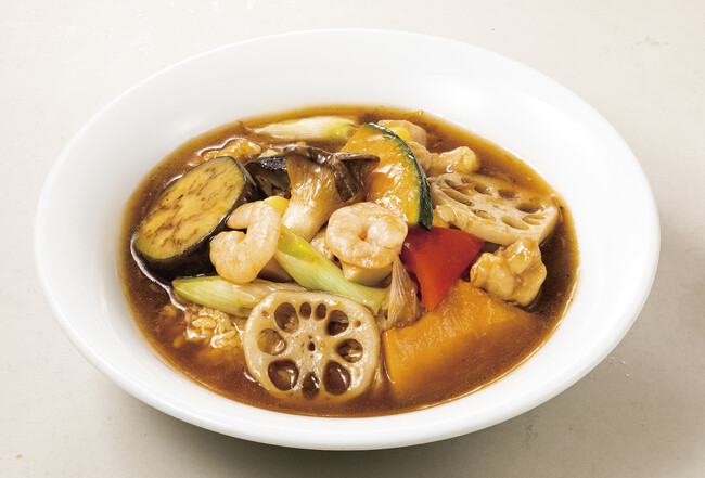 かぼちゃ、レンコン、茄子などの秋野菜や、ごろっと大きな海老や鶏肉など十種の具材を、中国料理の高級調味料であるXO醤で餡に仕上げ、パラッと炒めたチャーハンにあわせました。具材の豊かな食感が楽しめる餡かけチャーハンです。