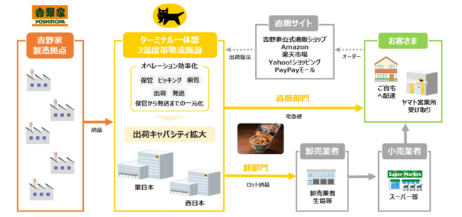 今回、吉野家とヤマト運輸は、高まる中食需要に対応し、個食用冷凍食品の出荷キャパシティをさらに拡大するため、外販事業における流通スキームを見直し、持続可能なサプライチェーンを構築します。