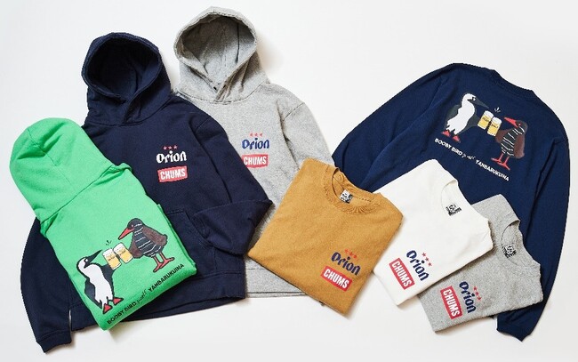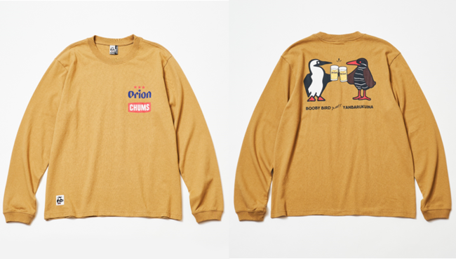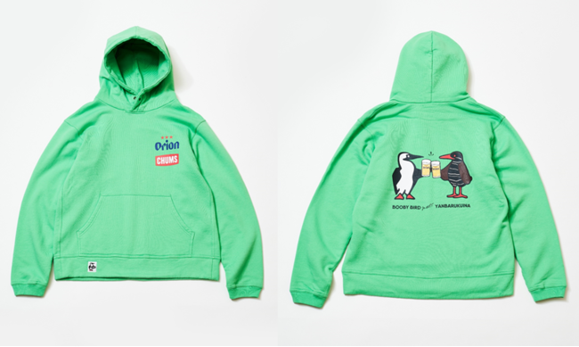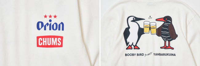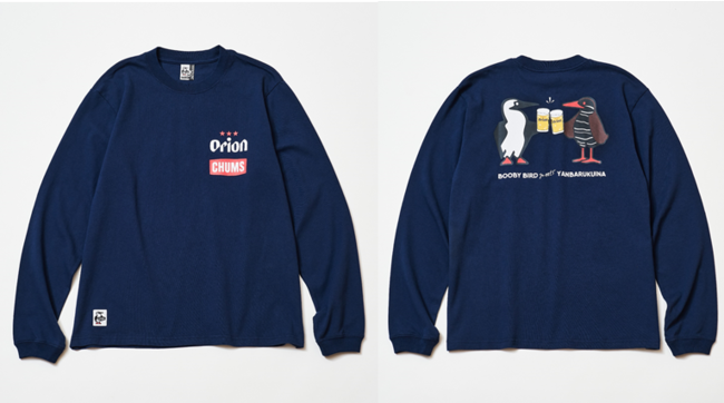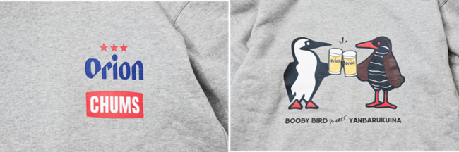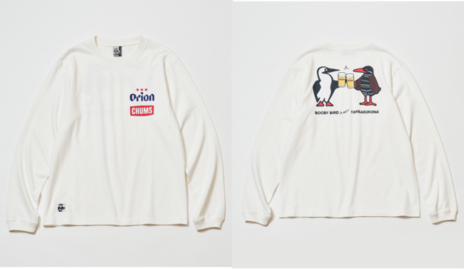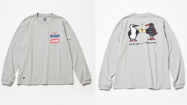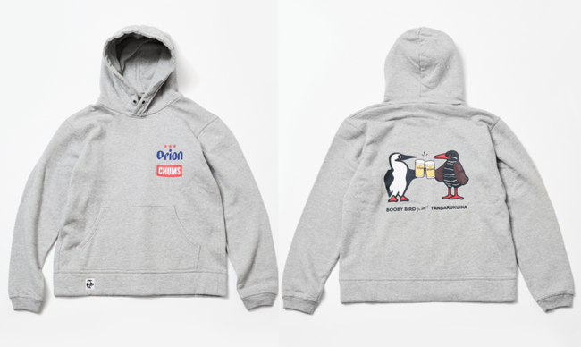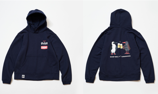 今回のアイテムは、これからの秋冬シーズンに活躍するパーカーとロングスリーブTシャツの2種。CHUMSのマスコット「ブービーバード」と、沖縄本島北部のやんばるエリアにのみに生息する固有種「ヤンバルクイナ」が登場し、オリオンビールで乾杯する様子をデザインしました。