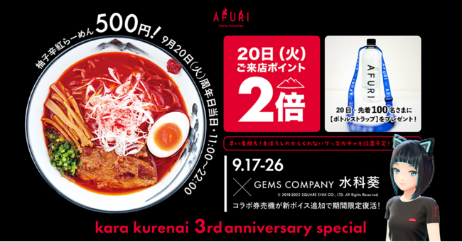 ●9月20日:周年日当日、看板商品「柚子辛紅らーめん」を500円(税込550円)でご提供!●9月17日~26日:券売機が喋る!歌う!アイドル[GEMS COMPANY: 水科葵]コラボ券売機の復活!●辛紅グッズガチャの設置やLINEショップカードのポイント2倍、ノベルティプレゼントなども実施!