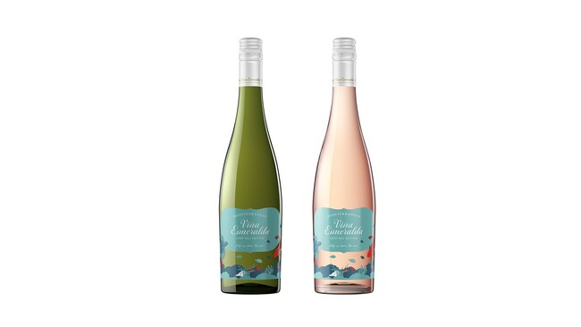 「ヴィーニャ・エスメラルダ」 は、1976年に誕生し、47年に渡り愛され続けているスペインワインです。日本語で、“エメラルドのワイン”を意味し、“地中海など海辺のリゾート地で、仲間とリラックスしながら楽しむワイン”をコンセプトに白・ロゼ・オレンジ・スパークリングの4アイテムを販売しています。昨年に続き、リミテッド・エディションではプラスチックフリーの海を目指す海洋保護団体「グラヴィティ・ウェーブ」とパートナーシップを組み、一本購入につき、地中海に廃棄されたプラスチックボトルを10本回収する取り組みを実施します※。本年のデザインは「深海」をテーマに、活気に満ちた海の世界に敬意をもって、海の多様性を表現しています。
