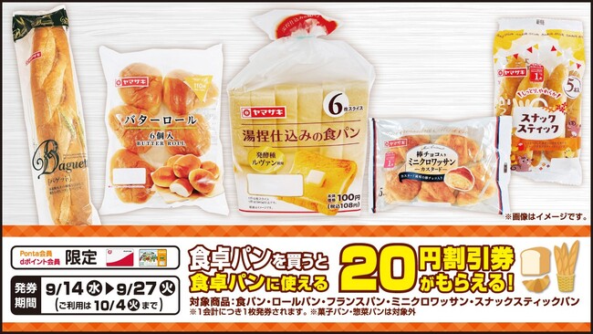 発券条件:期間中、Pontaカードまたはdポイントカードをご提示の上、対象の食卓パンをご購入いただきますと、次回食卓パン各種購入時にご利用いただける20円割引券を、1会計につき1枚進呈します。