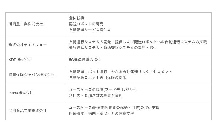 川崎重工業株式会社、株式会社ティアフォー、KDDI株式会社、損害保険ジャパン株式会社、menu株式会社、武田薬品工業株式会社による自動配送サービスの提案が2022年9月12日、東京都の「西新宿の課題解決に資する5G等先端技術サービスの都市実装に向けたプロジェクト」※1に採択されました。