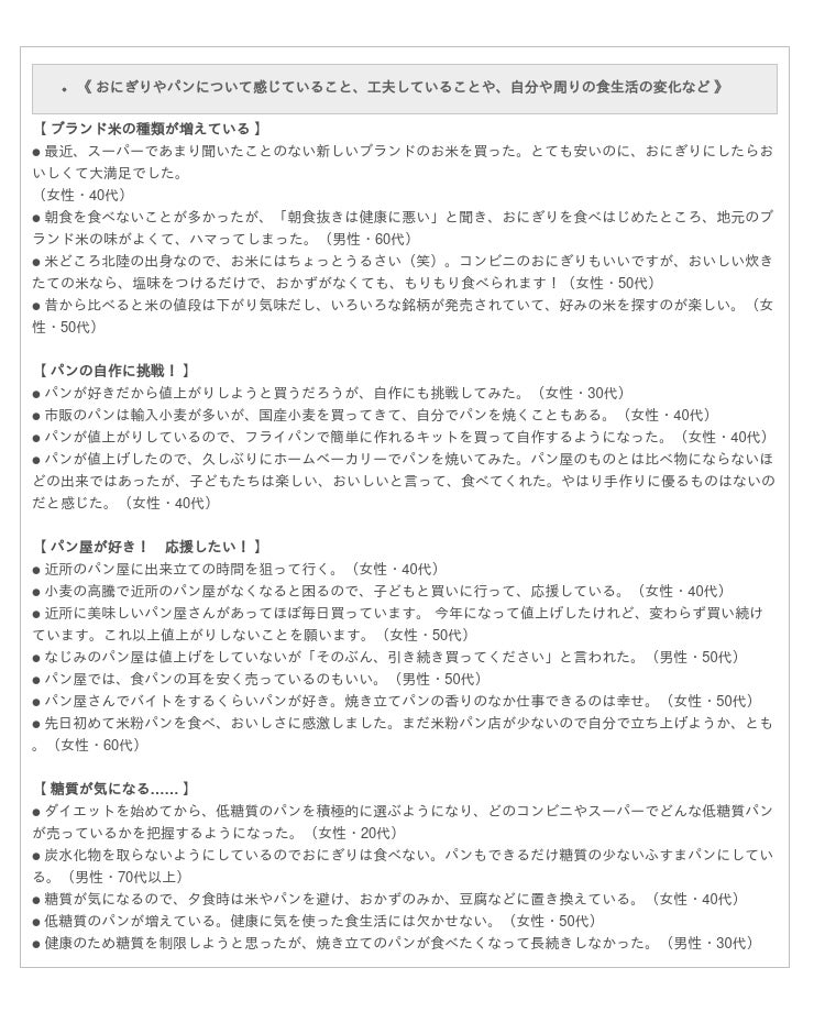 おにぎりやパンについて感じていることやエピソードなどを自由回答で教えてもらいました。「コロナ禍による影響で買い物に行く頻度を減らしたから」、あるいは「値上がりしたから」など、いろいろな理由で、おにぎりやパンを自作する人が増えているようです。一方で、「手間を考えたらやっぱりお店で買う」「ものによっては自作するよりコストパフォーマンスがいい」と、コンビニやスーパーを改めて評価している人もいました。