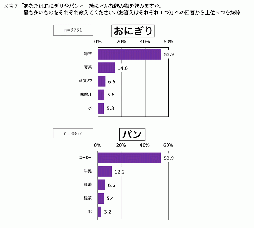 おにぎりの場合は「緑茶」(53.9%)、パンの場合は「コーヒー」(53.9%)と、どちらも50%以上の支持を受け、2位と40ポイント前後の差をつけています。