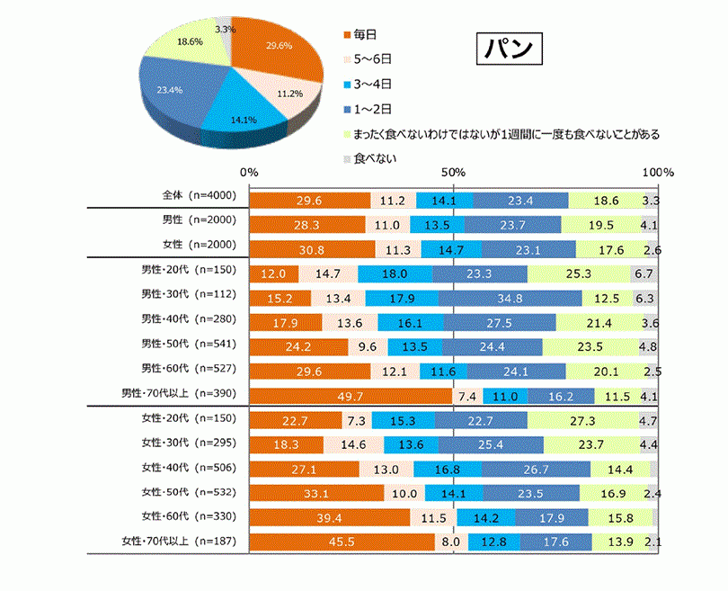 男女を比べると、60代までは女性が高く、「70代以上」になると逆転します。「男性・70代以上」では49.7%と、ほぼ半数がパンを毎日食べているという結果です。