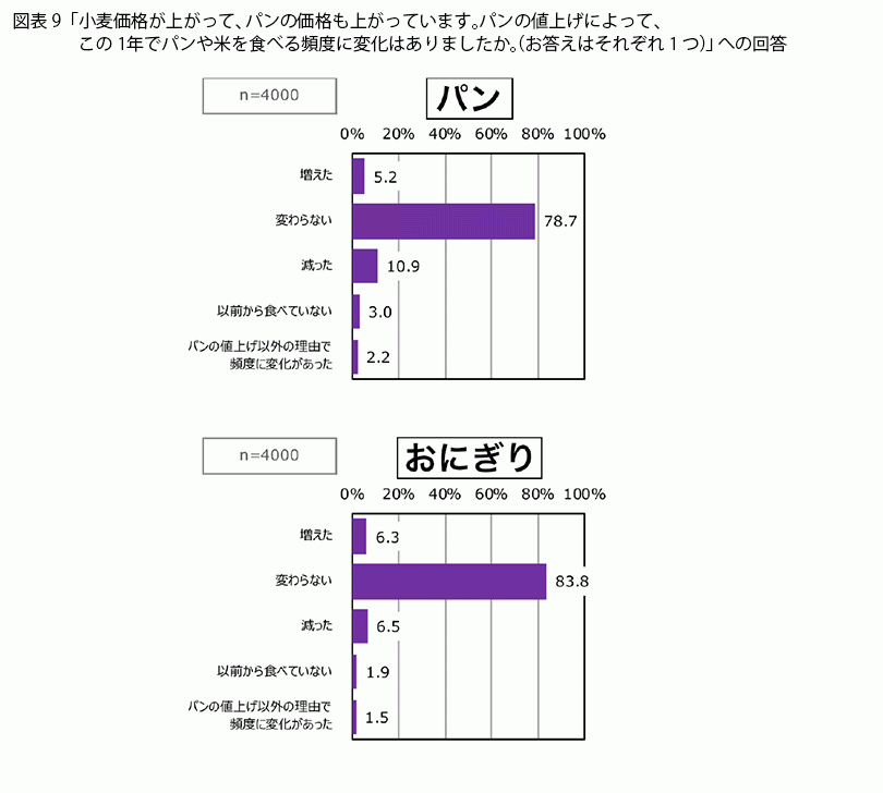 次に、パンの値上げによって、この1年でパンや米を食べる頻度に変化があるかを聞いたところ(図表9)、「変わらない」という人がパン(78.7%)とおにぎり(83.8%)の両方で、最も多かったです。