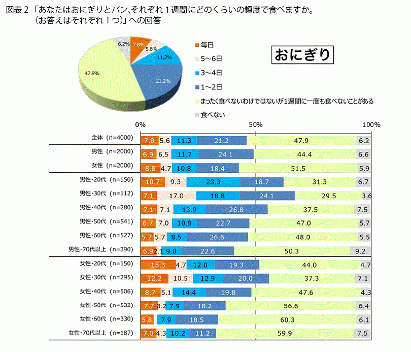 図表1では米とパンを比較しましたが、今度はおにぎりとパンを比べてみます。1週間にどのくらいの頻度でおにぎりやパンを食べるかを聞いたところ(図表2)、「毎日」と回答した人は、おにぎりは7.8%、パンは29.6%でした。