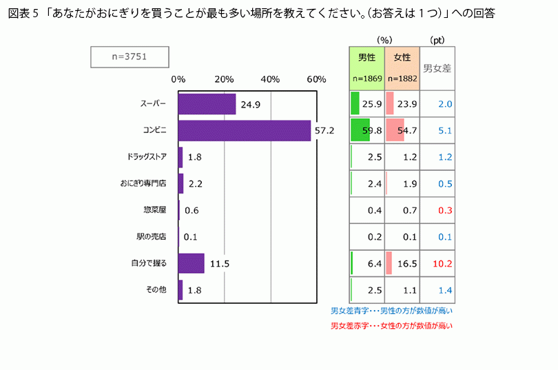 おにぎりは昼食に、パンは朝食に食べる人が多いという結果でしたが、おにぎりの場合は「出先のコンビニで買って、すぐ食べる」人が多いのかもしれません。パンを「自分で作る」ことが最も多いという人は2.5%でしたが、自作はハードルが高いようで、おにぎりを「自分で握る」ことが最も多いという人(11.5%)と比べると低い割合です。ただ、「自分で握る」と回答した人は男性(6.4%)と女性(16.5%)で10ポイントの差があります。