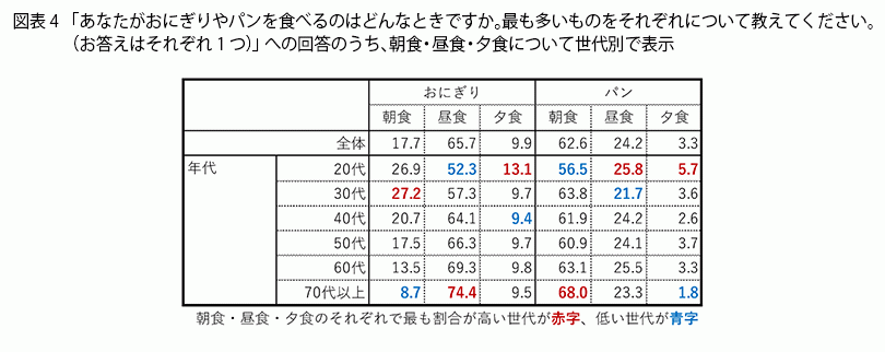 「朝食」「昼食」「夕食」と回答した人を世代別に見ていくと(図表4)、結構な振れ幅があります。「おにぎりを朝食で食べることが多い」と回答した「20代」「30代」は3割近いですが、「70代以上」では10%未満です。同様に「おにぎりを昼食で食べることが多い」という人は、最も高い「70代以上」が74.4%で、最も低い20代が52.3%と、20ポイント以上の差があります。